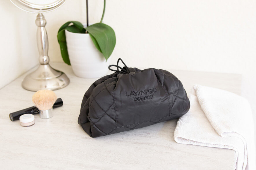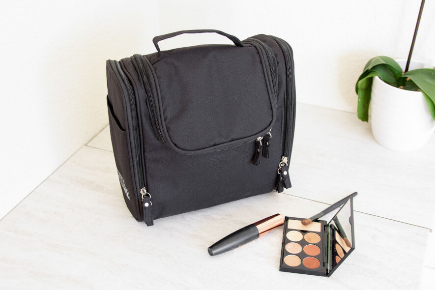 The Lay-n-Go is the most unique bag that we tested. Like the name implies, it lies flat in a circle with all of your toiletries inside. Then when you’re ready to go, you cinch it up. While it’s nice to have access to all of your products at once without digging around, we weren’t sold on this bag. The material has a sturdy, quilted feel to it, but it still felt less than secure. Because there are only a few straps sewn to the inside of the Lay-n-Go, most of your products are loose and tumbling around. One plus to this bag, however, is that it can go in the washer, (but foundation and mascara come off of it pretty well with a good wipedown).