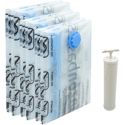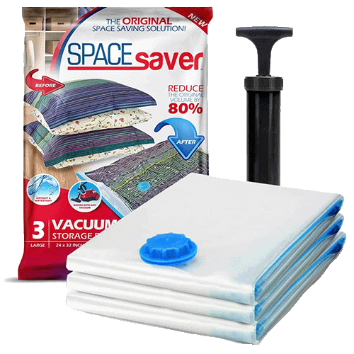 Vacuum storage bags are a must-have for storing seasonal use items in a small space. Made of durable, lightweight polypropylene plastic, they come in four or five different sizes and can hold sweaters, blankets, comforters, towels, or any bulky fabrics, which are then sealed inside and compressed flat by removing air with a vacuum cleaner hose or a hand pump.
